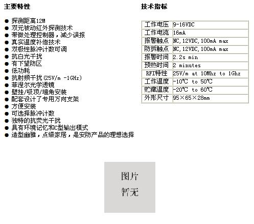 具有信號捕捉能力強,誤報、漏報率低,低功耗和真實溫度補償的特點。產品技術含量高、制作工藝考究、外觀造型高雅,而且性能穩定,使用壽命期長。特殊的透鏡設計,無下視死角,既可墻掛式也可吸頂式安裝。配合RA93安裝支架會更加方便地施工和安裝